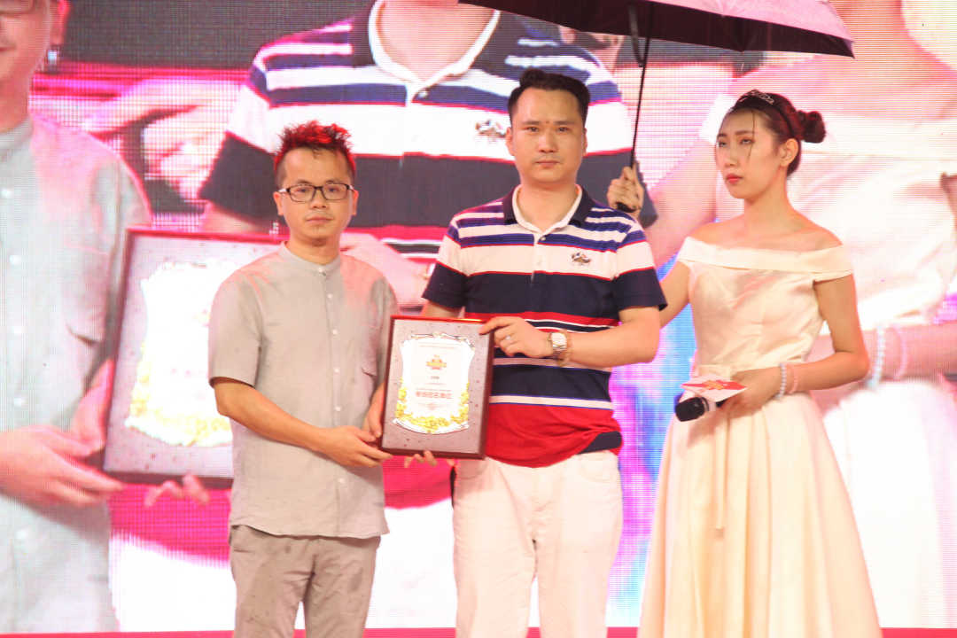 组委会代表张朕先生为宜乐居建材家居广场塘厦店总经理冯坤坤先生专场冠名授牌